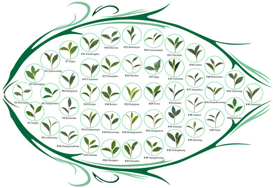 All 45 of the different tea tree germplasm resources featured in this study were acquired from the Tea Tree Germplasm Resource Nursery of Wuyi University, Wuyishan City, Fujian Province, China (117°59′51.88″ E, 27°44′16.17″ N). 45 tea tree germplasm resources were planted in the same plot. The tea tree germplasm resource nursery was situated 216 m above sea level, the soil was an acidic red loam, the average annual temperature was 19 °C, the annual rainfall was 1284 mm, the average humidity was 74%, and the age of the planted tea trees was 10 years. In October 2022, a total of 45 tea germplasm resources (Figure 8, Table S1) were sampled for rhizosphere soil and leaf samples. Soil samples were used to determine available nutrients (available nitrogen, available phosphorus, and available potassium) and to perform the amplification sequencing of fungal diversity and qRT-PCR analysis of characteristic fungi. Leaf samples were used to determine tea quality indexes (tea polyphenols, theanine, caffeine). The sampling method for rhizosphere soil of tea trees was the S-type sampling method. Specifically, for each variety of tea trees, eight tea trees were randomly selected, litter on the soil surface was removed, tea trees were gently dug out, the tea tree root system was removed, soil adhering to the root surface was shaken off, and soil still adhering to the roots was collected as tea tree rhizosphere soil, which was replicated after sufficient mixing [69]. While collecting the rhizosphere soil of the tea tree, one bud and two leaves of the tree were collected and thoroughly mixed to create a replicate [68]. Three independent replicates were taken for each tea tree variety.
