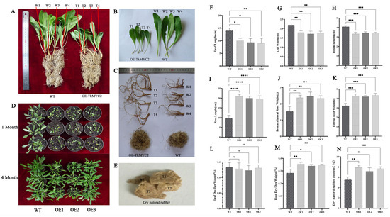 Analysis of physiological indicators between wild-type and OE-TkMYC2 −transgenic TKS. (A) Comparison of overall appearance between wild-type and OE-TkMYC2-transgenic TKS. (B) Comparison of leaf size between wild-type and OE-TkMYC2-transgenic TKS. (C) Comparison of TKS roots between wild-type and OE-TkMYC2-type. (D) Comparison of growth status between wild-type and OE-TkMYC2-transgenic TKS at 1 and 4 months of age. (E) NR extracted by alkaline boiling method. (F–N) Graphical presentation of leaf length, leaf width, petiole length, root length, fibrous and lateral root weight, dry/wet leaf weight, dry/wet root weight, and dry NR content for wild-type and OE-TkMYC2-transgenic TKS. (T1, T2, T3, T4) represent the four biological replicates of OE-TkMYC2-transgenic TKS; (W1, W2, W3, W4) represent the four biological replicates of wild-type TKS. (OE1, OE2, OE3) represent the three groups of OE-TkMYC2-transgenic plant lines (* p < 0.05, ** p < 0.01, *** p < 0.0005, **** p < 0.0001, ns p > 0.05).