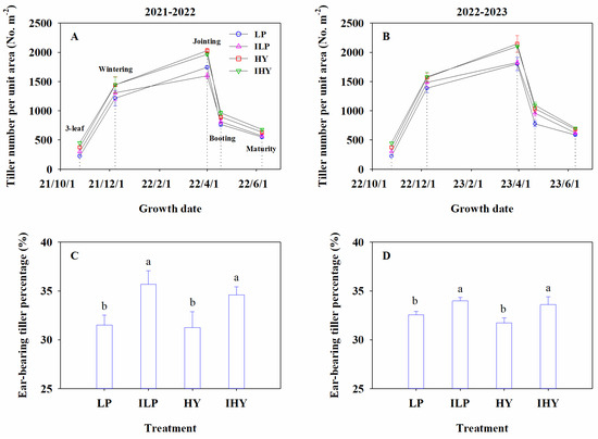 The dynamic of tiller number per unit area and ear-bearing tiller percentage under different integrated treatments in 2021–2022 and 2022–2023. (A,B), tiller number per unit area; (C,D), ear-bearing tiller percentage. LP, local traditional practice; ILP, improved local traditional practice; HY, high-yield agronomic management; IHY, improved high-yield agronomic management. Error bars represent the standard deviation of the mean. Different lowercase letters indicate significant differences (p < 0.05). Dotted lines are measurement periods.