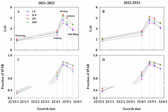 The dynamic of leaf area index (LAI) and fraction of IPAR under different integrated treatments in 2021–2022 and 2022–2023. (A,B), LAI; (C,D), fraction of IPAR. LP, local traditional practice; ILP, improved local traditional practice; HY, high-yield agronomic management; IHY, improved high-yield agronomic management. Error bars represent the standard deviation of the mean. Dotted lines are measurement periods.