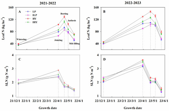 The dynamic of leaf N accumulation and specific leaf N content (SLN) under different integrated treatments in 2021–2022 and 2022–2023. (A,B), leaf N; (C,D), SLN. LP, local traditional practice; ILP, improved local traditional practice; HY, high-yield agronomic management; IHY, improved high-yield agronomic management. Error bars represent the standard deviation of the mean. Dotted lines are measurement periods.