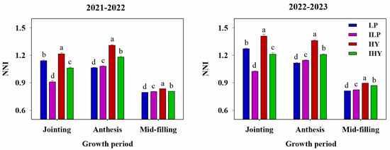 N nutrition index (NNI) under different integrated treatments in 2021–2022 and 2022–2023. LP, local traditional practice; ILP, improved local traditional practice; HY, high-yield agronomic management; IHY, improved high-yield agronomic management. Error bars represent the standard deviation of the mean. Different lowercase letters indicate significant differences (p < 0.05).