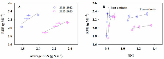 Radiation use efficiency (RUE) in relation to average specific leaf N content (SLN) and N nutrition index (NNI) in 2021–2022 and 2022–2023. (A), total RUE against average SLN; (B), pre-anthesis RUE against whole-plant NNI at anthesis and post-anthesis RUE against whole-spike NNI at mid-filling. LP, local traditional practice; ILP, improved local traditional practice; HY, high-yield agronomic management; IHY, improved high-yield agronomic management.
