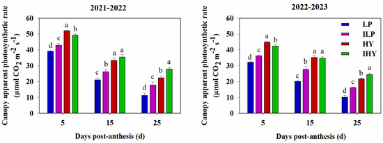 Canopy apparent photosynthetic rate under different integrated treatments in 2021–2022 and 2022–2023. LP, local traditional practice; ILP, improved local traditional practice; HY, high-yield agronomic management; IHY, improved high-yield agronomic management. Error bars represent the standard deviation of the mean. Different lowercase letters indicate significant differences (p < 0.05).