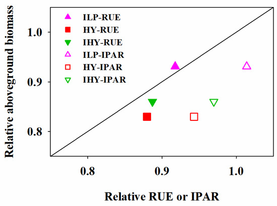 We analyzed the aboveground biomass responses according to integrated agronomic management practices in terms of IPAR and RUE. The relative contributions of IPAR or RUE to the reduction in aboveground biomass obtained with LP differed significantly among the other three treatments (Figure 7). We compared the relative contributions of reduced IPAR or RUE for ILP, HY, and IHY relative to LP. The closer a data point is to the y = x line, the more important it was in determining the aboveground biomass loss. The reduction in RUE was a far more important determinant of the aboveground biomass than the reduction in IPAR. Decreases in either RUE or IPAR were a more important determinant of the aboveground biomass for ILP than for both HY and IHY. The relative contribution of RUE was slightly more important for IHY than for HY; however, no marked differences in the relative contribution of IPAR were found between IHY and HY.
