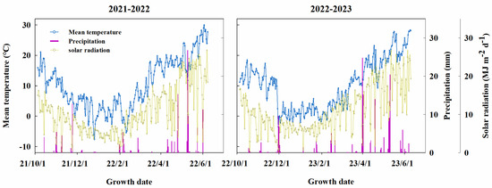 Field experiments were conducted during the winter wheat growing season in 2021–2022 and 2022–2023 at the experimental station of Weifang University of Science and Technology in Weifang, Shandong Province, China (36°55′ N, 118°46′ E). The region has a temperate continental monsoon climate, with an annual average temperature, solar duration, total solar radiation, and total precipitation of 12.7 °C, 2548 h, 5190 MJ m−2, and 593.8 mm, respectively; the cumulative temperature above 10 °C is 4303 °C. The frost-free period over 1 year is 199 days. The soil is a sandy loam with 17.10 g kg−1 organic matter, 1.13 g kg−1 total N, 29.35 mg kg−1 available P, and 87.67 mg kg−1 available K in the upper 0.20 m of the soil before seeding in October 2021. Daily mean temperature, precipitation, and solar radiation during the two growing seasons are shown in Figure 8. All meteorological data used in the analysis were obtained from a local automatic weather station located <1000 m from the experimental field. The preceding crop grown in the experimental field was summer maize. Following harvest, all straw was plowed back into the soil every year.