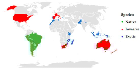 C. parqui belongs to the Solanaceae family, a family of dicotyledonous angiosperms largely cultivated by humans as horticultural—Solanum tuberosum, Solanum melongena, Solanum lycopersicum, and Capsicum annuum, medicinal—Atropa belladonna, and recreational crops—Nicotiana tabacum. The family comprises 100 genera with about 2500 species. The genus that hosts the largest number of plants is Solanum, with about 1400 species; conversely, Licianthes includes 200 species, and Cestrum has 175 species [9,10]. Solanaceae are represented in the wild on all continents, with a greater number of species in the American continent, and they adapt well to almost all ecosystems, although most of them prefer warmth rather than intense cold. C. parqui is native to Brazil, Bolivia, northern and central Chile, Peru, Paraguay, Uruguay, and northern and central Argentina, but, today, it is widely spread in southeastern and eastern parts of Australia, New Zealand, in some parts of the southern United States of America like California and Texas, and in much of Europe (Figure 2) [11].
