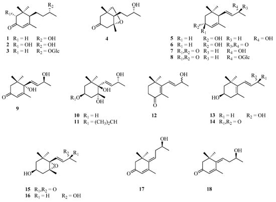 - D’Abrosca, B.; DellaGreca, M.; Fiorentino, A.; Monaco, P.; Oriano, P.; Temussi, F. Structure elucidation and phytotoxicity of C13-nor-isoprenoids from Cestrum parqui. Phytochemistry 2004, 65, 497–505. [Google Scholar] [CrossRef]