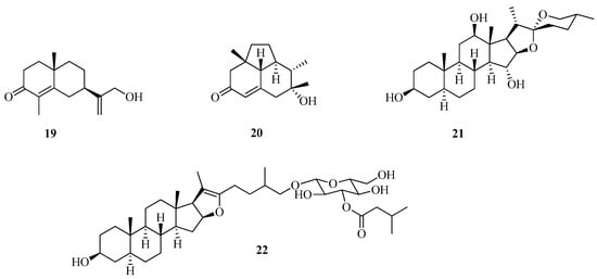 Sesquiterpenes (19–20), spirostane (21), and pseudosapogenin (22) isolated from C. parqui.