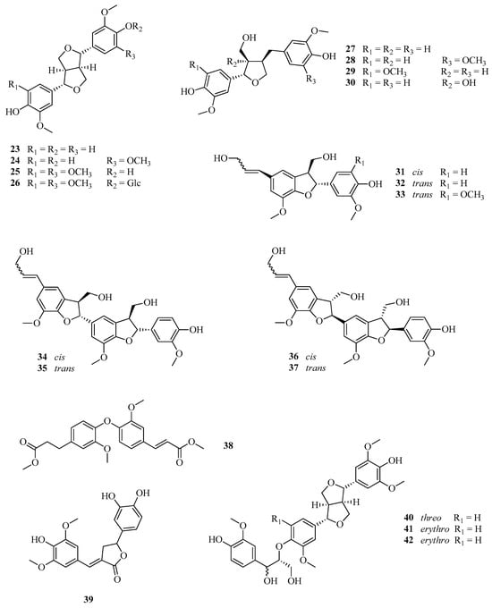 Compounds 23–35 and 40–42 were tested on A. retroflexus, P. oleracea, and C. album, in a concentration range varying from 10−4 to 10−8 M. Lignans 23–26 were the most active on A. retroflexus, inhibiting its germination even at the lowest concentration, while compounds 29–30 showed anti-germination activity on P. oleracea and anti-radical activity on A. retroflexus. All compounds were slightly stimulating for shoot elongation of C. album and P. oleracea.