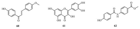 Only aromatic compounds 55 and 56 on L. sativa and chalcone 60 on A. cepa showed weak inhibitory effects on germination, while all others were practically inactive. Results on root elongation showed that some compounds, such as product 45, could have a phytotoxic effect on S. lycopersicum but have a stimulating effect on A. cepa, or compound 44, stimulating for A. cepa but inhibiting for L. sativa. Compounds 45 and 48 were able to inhibit the shoot length of S. lycopersicum and A. cepa by 66% and 60%, respectively, at a concentration of 1 nM [46].