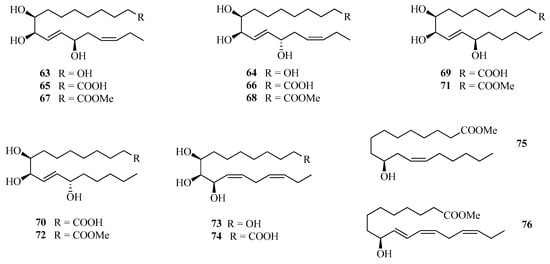 Polyol fatty acids 63–64 and 73, methylated oxylipins 67 and 68, and oxylipins 65–66, 69–72, and 74–76 (Note that 63/64, 65/66, 67/68, 69/70, and 71/72 are five diastereomeric couples of compounds).