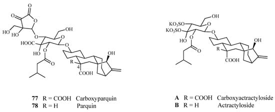Two kaurenic glycosides named carbossiparquin (77) and parquin (78) have been isolated from the leaves of C. parqui, whose structures have been determined using NMR techniques and mass spectrometry [56] (Figure 9 and Table 4).