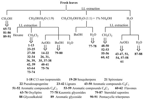 The bark and, especially, the leaves of this shrub contain a large number of secondary metabolites, generally of low molecular weight. These metabolites have been isolated from polar infusions obtained via extraction with methanol and/or ethanol/water (Scheme 1), purified using direct and reverse-phase chromatographic techniques (on column or HPLC), and identified using spectroscopic techniques (NMR, both one-dimensional and two-dimensional) and mass spectrometry. Specifically, from the organic infusions, C13-nor-isoprenoids (1–18, Figure 3), sesquiterpenes (19–20, Figure 4), a spirostane (21, Figure 4), a pseudosapogenin (22, Figure 4), lignans (23–42, Figure 5), aromatic compounds (43–47 and 89, Figure 6), oxylipins (63–76, Figure 8), kaurenic glycosides (77–78, Figure 9), steroid saponins (79–86, Figure 10), an aromatic glycoside (89, Figure 10), and pentacyclic triterpenes (90–91, Figure 10) have been isolated. Conversely, from the aqueous infusion, aromatic compounds (48–58, Figure 6), flavones (60–62, Figure 7), a steroid saponin (87, Figure 10), and a glycoalkaloid (88, Figure 10) have been isolated.