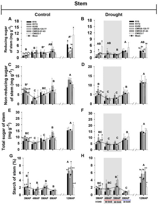 The mean sugar contents across genotypes including reducing, non-reducing, and total sugar of the stem (Figure 4 and Table S5) were generally much lower than those in the leaves (Figure 4). The stem reducing sugar in the control plants tended to increase with age from 3MAP to 6MAP (Figure 4A) while that of the stressed plants remained stable from 3MAP to 5MAP, but significantly (p < 0.05) increased after 30 days of rewatering (30DAR/6MAP) (Figure 4B). Moreover, the mean reducing sugar across genotypes of the 5MAP stressed (1.48 mg g−1) plants after 60 days of stress was significantly lower than that of the 5MAP control (2.18 mg g−1) plants. Similarly, at harvest, the mean reducing sugar across genotypes of the stressed (3.04 mg g−1) plants was significantly lower than that of the control (4.79 mg g−1) ones. At harvest, the highest reducing sugar in the stem of the control plants was recorded in CM523-7 (11.17 mg g−1) followed by RY9 (6.54 mg g−1) while the others had intermediate values (1.62–4.67 mg g−1). However, the reducing sugar content in CM523-7 was drastically reduced to 4.84 mg g−1 in the stressed plants while that in the remaining genotypes was not significantly changed. For both well-watered and stressed groups, the mean of stem non-reducing sugar across genotypes was significantly (p < 0.01) reduced at 4MAP compared with that at 3MAP, and then was increased at 5 and 6MAP (Figure 4C,D). During the 60-day period of water-holding, the stressed plants tended to have lower non-reducing sugar than the controls. However, at harvest, the levels of non-reducing sugar in the stem of both groups were similar at 11 mg g−1 which was higher than all the other growth stages. The pattern of changes in the stem total sugar with plant age was closely similar to that of the non-reducing sugar (Figure 4E,F).