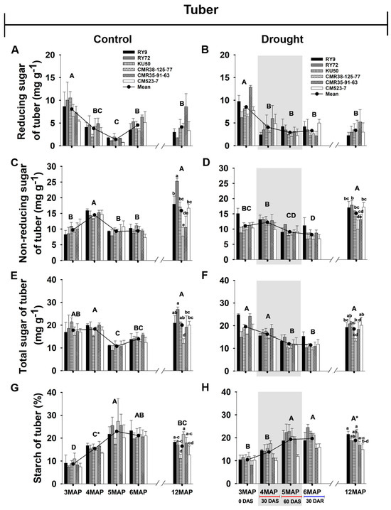 Tuber sugar (reducing, non-reducing, and total) and starch of the six cassava genotypes including Rayong 9 (RY9), Rayong 72 (RY72), Kasetsart 50 (KU50), CMR38-125-77, CMR35-91-63, and CM523-7 at the plant age of 3, 4, 5, 6, and 12 months after planting. The plants were grown under the control ((A,C,E,G); continuous irrigation from 0MAP to 12MAP) and drought ((B,D,F,H); irrigation was withheld for 60 days in the dry season during 4MAP and 5MAP then rewatered until 12MAP) treatment. Different capital letters indicated significant (p < 0.05) differences among the different plant ages, whereas those among genotypes are denoted with different lowercase letters. The significant differences (p < 0.05) between water regimes are denoted by *. The gray shading represents the period without irrigation and rainfall. (MAP, months after planting; DAS, days without irrigation; DAR, days after rewatering).