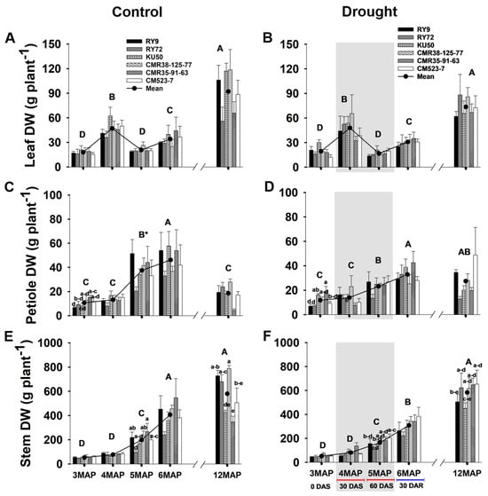 The above-ground (leaves, petioles, and stems) dry weight (DW) of the six cassava genotypes growing under different water managements were investigated at the ages of 3, 4, 5, 6, and 12MAP (Figure 6, Tables S7 and S10). The dry weight of leaves in the control and stressed groups had similar patterns of change from 3MAP to 6MAP, and the mean across genotypes at each age was also similar between the two fields. The leaf DW of the 4MAP plants significantly (p < 0.01) increased (approximately 2.5 times) compared to the 3MAP ones. Due to heavy leaf senescence and abscission, leaf DW at 5MAP significantly decreased to a level similar to the 3MAP stage, but significantly increased (approximately 74% increase) at 6MAP after rewatering. At 12MAP, the mean leaf DW significantly increased (2.7- and 2.3-folds in the control and stressed plants, respectively) compared with that at 6MAP, but there were no significant differences among the genotypes in both water managements (Figure 6A,B).