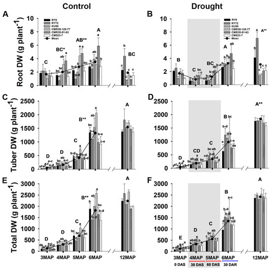 Below-ground (root and tuber) and total biomass of six cassava genotypes including Rayong9 (RY9), Rayong72 (RY72), Kasetsart50 (KU50), CMR38-125-77, CMR35-91-63, and CM523-7 at the plant ages of 3, 4, 5, 6, and 12MAP months after planting. The plants were grown under the control ((A,C,E); continuous irrigation from 0MAP to 12MAP) and drought ((B,D,F); irrigation was withheld for 60 days in the dry season during 4MAP and 5MAP then rewatered until 12MAP) treatment. Each capital letter at each plant age represents the mean of the six genotypes. Different capital letters indicated significant (p < 0.05) differences among different plant ages, whereas those among genotypes are denoted with different lowercase letters. The significant differences (p < 0.05 and p < 0.01) between water regimes are donated by * and **, respectively. The gray shading represents the period without irrigation and rainfall. (MAP, months after planting; DAS, days without irrigation; DAR, days after rewatering).