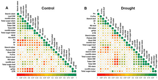 For the drought plants, the tuber DW displayed significantly (p < 0.01) positive correlations with the total DW (0.99), stem DW (0.84), leaf DW (0.57), root and petiole DW (0.42), non-reducing (0.69) and total sugar (0.67), and starch (0.48) in stem, but had significantly negative correlations with ETR (−0.68) and ΦPSII (−0.64) (Figure 8B). The tuber starch content of the drought plants showed a significantly (p < 0.01) negative correlation with tuber reducing sugar (−0.59), tuber total sugar (−0.45), ΦPSII (−0.52), and ETR (−0.56), but displayed significantly positive correlations with dry weight of tuber (0.46) and total DW (0.44). The WUE of drought plants showed a significantly (p < 0.01) negative correlation with the Tr (−0.68), gs (−0.58), total sugar (−0.43), starch (−0.38), and non-reducing sugar (−0.32) of leaf, but that of the control plants displayed significantly negative correlation with only Tr (−0.47) and gs (−0.39). Interestingly, non-reducing sugar and total sugar in the stems of the control plants (Figure 8A) displayed significantly (p < 0.01) negative correlations with photosynthetic parameters (Pn, gs, Tr, ΦPSII, and ETR), but those of the drought plants (Figure 8B) displayed significantly negative correlation with only chlorophyll fluorescence parameters (ΦPSII and ETR).