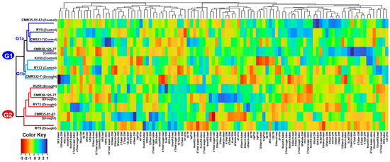 For the clear visualization of relationships among the cassava genotypes growing in different water regimes, agglomerative hierarchical clustering analysis (HCA) was carried out and their results are shown in Figure 9. For HCA, the data distributions of photosynthesis (Fv/Fm, ΦPSII, ETR, Pn, gs, Tr, and WUE), carbohydrate content (reducing, non-reducing, and total sugar, and starch of leaf, stem, and tuber), plant biomass (dry weights of leaves, petioles, stems, roots, and tuber) at the plant age 3, 4, 5, 6, and 12MAP were used. The heatmap clearly divided cassava into two major clusters (G1 and G2) based on physiological responses, carbohydrate partitioning, and crop biomass. All six genotypes grown under the control well-watered conditions are included in G1 which also contained CM523-7 in the drought condition, while the drought plants of the remaining five genotypes were clustered in G2. Within G1, the control plants of CMR35-91-63, RY9, CM523-7, and CMR38-125-77were grouped together in the subgroup G1a while the control plants of KU50 and RY72 were grouped together with the drought plants of CM523-7 in the subgroup G1b.