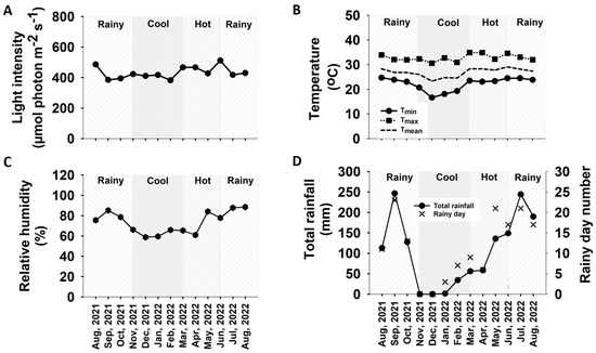 The experimental field was at the field crop research station, Faculty of Agriculture, Khon Kaen University, Northeast Thailand (16°28′29.7″ N, 102°48′37.3″ E, altitude 195 m above sea level). The climatic condition in the area is a tropical savanna climate (Aw), which is most commonly found in Africa, South America, and Asia [64]. The weather conditions in the dry season can become severe, with some months having no rainfall, and drought conditions often prevail during the course of the year. For Thailand, seasonal variation is under the influence of monsoon winds, and can generally be divided into 3 seasons as follows: hot season or pre-monsoon from March to May, rainy season or southwest monsoon season from June to October, and cool season or northeast monsoon from November to February. The meteorological conditions in the field site including light intensity, temperature, and relative humidity were recorded every 30 min from the date of planting until the plants were 12 months old (August 2021 to August 2022) using an automatic recording weather station (Watchdog 2000, Spectrum Technologies Inc., Lincoln, NE, USA). The monthly mean of light intensity, air temperature, relative humidity (RH), total rainfall, and number of rainy days in the experimental field are displayed in Figure 10 and Supplementary Table S1. The light intensity means of the rainy, cool, and hot seasons were 437.8, 406.6, and 454.2 µmol (photon) m−2 s−1, respectively (Figure 10A). Air temperature means were 27.8, 24.7, and 28.1 °C, with the mean minimum of 24.1, 18.7, and 23.3 °C, and mean maximum of 32.9, 31.7, and 34.0 °C in the rainy, cool, and hot seasons, respectively (Figure 10B), while the RH means were 82.2%, 62.2%, and 70.1%, respectively (Figure 10C). Total seasonal rainfall and total number of rainy days were 1070.2 mm and 102 days, while those during the cool and hot seasons were 35.8 mm and 10 days, and 250.1 mm and 36 days, respectively. There were no rainfall in November and December 2021.