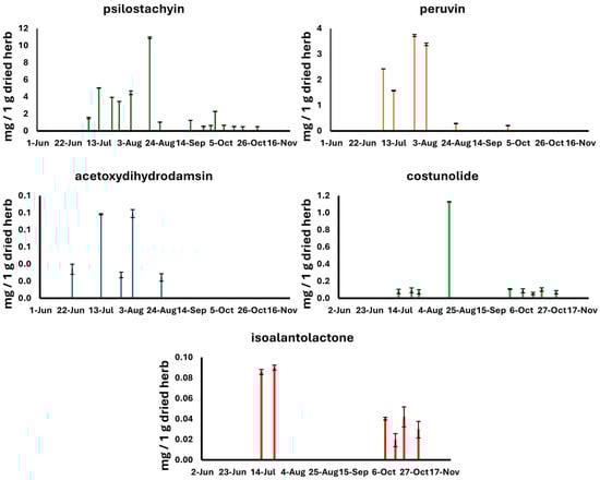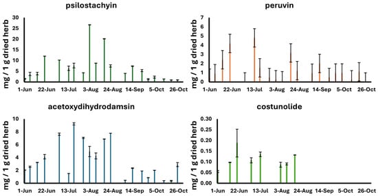 The amounts of the targeted marker compounds in the aerial parts of ragweed samples collected near Szeged and Nyíri are presented in Table 2 and Table 3, respectively. Figure 1 and Figure 2 graphically present the variations in the observed compounds over time. The aerial parts of the ragweed collected from June to October near Szeged contained mainly psilostachyin (1) and peruvin (2) and, in a smaller amount, acetoxydihydrodamsin (3), costunolide (4), and isoalantolactone (5) in the range of 0.02–0.10, 0.210–3.729, 0.499–10.917, 0.0561–1.128, and 0.019–0.090 mg/g, respectively. In the set of samples collected near Nyíri, psilostachyin (1) was observed in the highest amount (26.66 mg/g), together with peruvin (2) (4.80 mg/g), while the compounds acetoxydihydrodamsin (3) and costunolide (4) were observed with minor concentration ranges, and isoalantolactone (5) could not be identified. In general, the amount of sesquiterpene lactones analyzed was lower in the plant material samples collected near Szeged compared to those collected near Nyíri. The differences were significant (p < 0.001) for psilostachyin (1), peruvin (2), and acetoxydihydrodamsin (3), while the difference in the concentration levels of costunolide (4) was not significant.