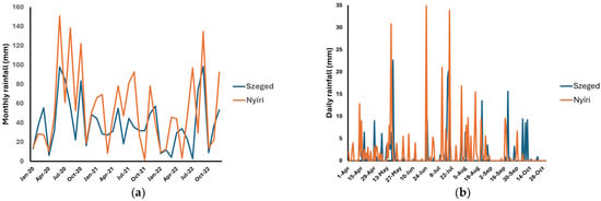 Monthly average rainfall recorded from 2020 to 2022 (a) and daily rainfall recorded from April to October in 2021 (b). Data source: HungaroMet.