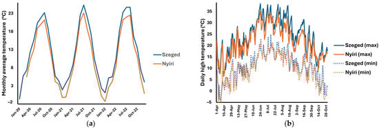 Monthly average temperatures registered from 2020 to 2022 (a) and the daily lowest and highest temperatures registered from May to October in 2021 (b). Data source: HungaroMet.