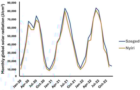 Monthly global solar radiation recorded at collection sites. Data source: HungaroMet.