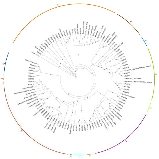 Phylogenetic analysis of bZIP proteins in C. mongolicum. The CmbZIPs are shown as clusters in the leaf transcriptome of C. mongolicum. Branch support was assessed with 1000 bootstrap replicates. The support values are provided at each node. The letters with different colors outside the circle indicate the various subgroups. AtbZIPs represent the bZIPs from A. thaliana. The 11 Chrysanthemum bZIPs are displayed with their sequence IDs and names.