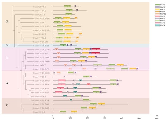 A total of 10 protein-conserved motifs with 15~50 amino acid residues were identified in the CmbZIPs with low E-values (<10−10) using the MEME tool (Table S2). At least one protein-conserved motif was found in all of the identified protein sequences (Figure 2). The number and type of conserved motifs in each of the five subclades were similar, but each subgroup had special characteristics. Motif 1, a conserved basic bZIP domain, was present in all of the members of the protein sequences, which confirmed the correctness of our identifications. Groups S and C had similar motif compositions, with most of the sequences containing motifs 1 and 2. We found that the protein sequences in group S had two different motif compositions: one consisted of motifs 1 and 9, and the other contained motifs 1, 2, and 8. In addition, groups A and I contained a significantly higher number of motifs than the other groups. Motif 7 predominantly existed in group I, while motifs 3 and 4 appeared only in group A. The specific motifs in each subgroup suggested their specific biological functions within the subgroup and the functional diversity of bZIP family genes.