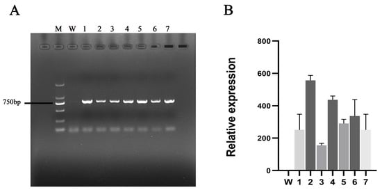 Identification of transgenic tobacco plants. (A) Genomic PCR for the identification of the transgenic plants. M: DL2000 marker, W: wild-type tobacco, lines 1–7: transgenic tobacco lines; uncropped gels are shown in Supplementary Figure S3. (B) Transcript levels of CmbZIP9 in wild-type and transgenic tobacco plants. Data are shown as mean ± SD (n = 3).