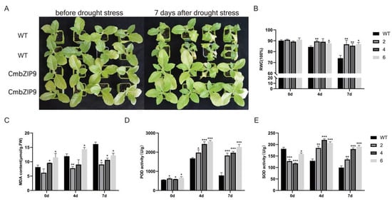 The constitutive expression of CmbZIP9 in tobacco enhanced drought tolerance. (A) Morphology of wild-type and CmbZIP9 transgenic plants before and after 7 days of drought stress treatment. (B) Relative water content (RWC) before and after drought treatment for 4 and 7 d. (C) MDA content before and after drought treatment for 4 and 7 d. (D) Peroxidase (POD) activity before and after drought treatment for 4 and 7 d. (E) Superoxide dismutase (SOD) activity before and after drought treatment for 4 and 7 d. The numbers 2, 4, and 6 indicate T1 generations of three different transgenic lines. Asterisks represent values that are significantly different from those of the wild type (* p < 0.05, ** p < 0.01, *** p < 0.001).