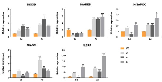 Expression levels of stress-related genes in wild-type and transgenic tobacco lines before and after 7 days of drought treatment. W: wild-type tobacco; 2, 4, and 6: T1 generations in three different transgenic lines. Data are presented as mean ± SD of three independent experiments. Asterisks represent values that are significantly different from those of the wild type (* p < 0.05, ** p < 0.01, *** p < 0.001).