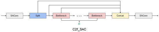 SAConv can make the network more flexible in adapting to features of different scales to recognize objects in images more accurately. The SAC component and global context module occupied by SAConv can well optimize the fixed sensory field and local continuity problems brought by ordinary convolution. Therefore, we incorporate it into the backbone of YOLOv8, and also incorporate SAConv into C2f to get the C2f_SAC module, the specific structure of C2f_SAC module is shown in Figure 4. In C2f_SAC, the input of the previous layer, after passing through a SAConv, can capture the information in the input feature maps in different scales, and dynamically fuses the convolution results at these different atrous rate. At the same time, while keeping the feature map size constant, it can capture the feature information at different scales and integrate the global information efficiently at the global scale.