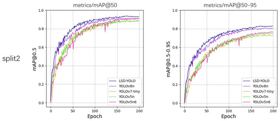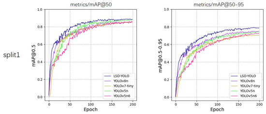 From the experimental results, our LSD-YOLO has better accuracy, completeness and precision in lemon detection, with mAP@50 reaching 92.89% and 88.36% for healthy lemons and diseased lemons, respectively, as well as higher scores for other metrics. Compared with the original YOLOv8n algorithm, LSD-YOLO reached 90.62% for mAP@50, an improvement of 2.64%, and 80.84% for mAP@50–95, an improvement of 2.97%, with only a 0.34 M parameter increase, which is significantly higher than the detection accuracy of other models. Moreover, the overall standard deviation of the improved LSD-YOLO is smaller than that of the original algorithm for mAP@50 and mAP@50–95, which fully demonstrates the better stability and robustness of the present model. The fluctuations in accuracy across the five models during the training process are depicted in Figure 5, Figure 6, Figure 7, Figure 8 and Figure 9.