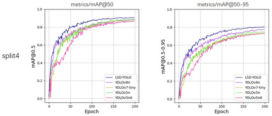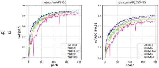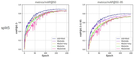 To verify the accuracy, validity, and stability of LSD-YOLO, we compared LSD-YOLO with YOLOv8n, YOLOv7-tiny [34], YOLOv5n6, and YOLOv5n [35], which are advanced target detection methods. Table 2 and Table 3 present the Precision (P), Recall (R), mAP@50, mAP@50–95, overall standard deviation, and parameter count discerned by these various models.