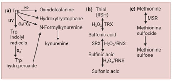 - Ehrenshaft, M.; Deterding, L.J.; Mason, R.P. Tripping up Trp: Modification of protein tryptophan residues by reactive oxygen species, modes of detection, and biological consequences. Free Radic. Biol. Med. 2015, 89, 220–228. [Google Scholar] [CrossRef]