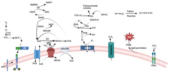 | Monodehydroascorbate peroxidase (MDHAR) {EC 1.6.5.4} | Chloroplast, Mitochondria, and Cytoplasm | Regenerates AsA by catalyzing the reduction in monodehydroascorbate using NADH or NADPH as an electron donor | [81] |