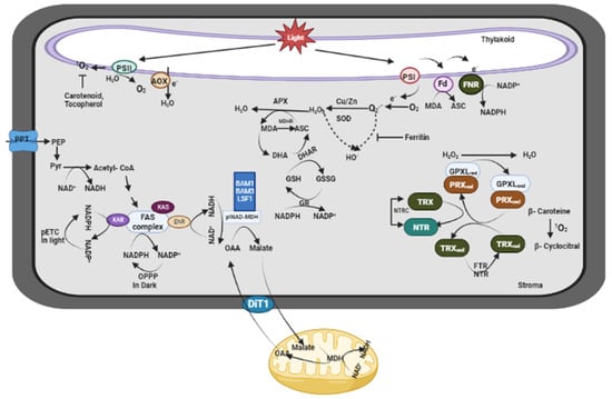 - Exposito-Rodriguez, M.; Laissue, P.P.; Yvon-Durocher, G.; Smirnoff, N.; Mullineaux, P.M. Photosynthesis-dependent H2O2 transfer from chloroplasts to nuclei provides a high-light signalling mechanism. Nat. Commun. 2017, 8, 49. [Google Scholar] [CrossRef] [PubMed]