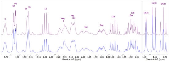 As there are two chiral centers in perillyl 2-methylbutanoate two diastereomers are possible. The synthetic sample was comprised of their unresolvable mixture on the DB-5MS column, while the NMR signals of these two diastereomers were also practically indistinct as will be described below. The spectra of the mixture of the synthesized esters were assigned with the aid of 1H NMR manual full spin spectral simulation (Figure 2, Table 2). The full spin analysis was performed by manually adjusting δH and J values to fit the experimentally available values and further optimized using MestReNova 11.0.3 software (tools/spin simulation). Although the recorded spectra represent the superimposed spectra of diastereomers (Supplementary Materials Figures S3 and S4), while the simulated spectra come from one diastereomer, the simulation outcome was in excellent agreement with the experimental data of the synthetic compound. This can be explained by the fact that the chiral centers are distant from one another within the molecule, resulting in no significant differences in the position and appearance of signals. These differences (mostly barely observable broadening) are visible only in certain signals, in the proximity of chiral centers (e.g., methyl group near the chiral center of the acidic part of the ester).