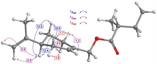Spectral simulation (Figure 2) allowed us to clearly discern the major couplings present among protons standardly buried within signals of higher order. The most significant coupling constants are shown in the structure in Figure 3. Three large constants, greater than 10 Hz, confirmed the approximately antiperiplanar position of hydrogens on the six-membered ring, placing the isopropylene group in a pseudo-equatorial position, as expected. Additionally, we noticed a large homoallylic constant of 4 Hz between the axial hydrogens in positions 4 and 7, besides two other homoallylic constants, of around 2 Hz. The reason for such a strong interaction between relatively distant hydrogen atoms can only be sought from their relative positions to the double bond, the parallel orientation of σC-H and πC=C, which further confirms the depicted 3D structure (Figure 3). The large value of one more long-range constant, the W-coupling constant of around 2 Hz, between equatorial hydrogens in positions 4 and 6, also confirmed the reliability of the depicted 3D structure of perillyl ester.