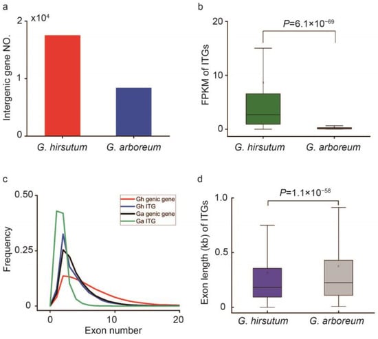 Figure 1. Characterization of the genic genes and ITGs obtained from tetraploid cotton G. hirsutum and diploid G. arboreum. (a) Histogram that shows the number (NO.) of ITGs from the transcriptome data of G. hirsutum and G. arboreum. (b) Boxplot that describes the FPKM of ITGs from G. hirsutum and G. arboreum. (c) Frequency curve chart that depicts the exon number distributions in genic genes and ITGs in G. hirsutum and G. arboreum. (d) Boxplot for the exon length distributions of ITGs in G. hirsutum and G. arboreum. One-Way ANOVA was used to analyze the significant difference of expression in G. hirsutum and G. arboreum (p < 0.01).