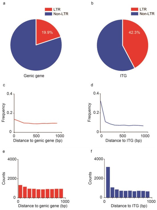 To further investigate the molecular mechanism for the formation of the ITGs, we analyzed the LTR frequency in the regions that were 1000 bp upstream and downstream along the genic genes and ITGs in G. hirsutum. A significant difference in the transposon insertion ratio was recorded between genic genes and ITGs. Only 19.9% of the genic genes contained LTRs in their exons (Figure 2a, Table 2). However, the transposon insertion rate was higher than 42.3% in ITGs (Figure 2b, Table 2). Notably, approximately 32.3% of the LTRs were within the range of less than 100 bp away from intergenic regions while only 13.6% occurred in the genic genes (Figure 2c,d).