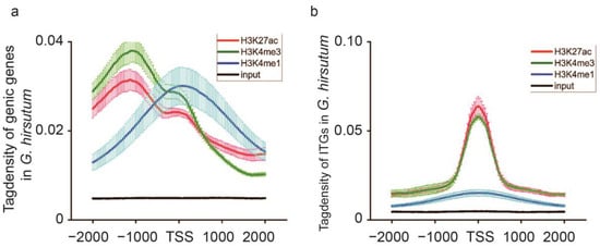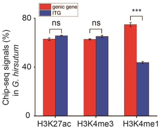 Further and systematic studies on the regulation of the expression of genic genes and ITGs in relation to transcriptional activation-related modifications (H3K27ac, H3K4me3, and H3K4me1) continued. In general, histone modification analysis is considered an auxiliary method for describing the transcriptional regulation of genes. According to ChIP-seq analysis against H3K27ac and H3K4me3, most of the genic genes and ITGs had transcription activation markers that were mainly located in the range from −2000 bp upstream to 2000 bp upstream. Similar reports mentioned that the majority of active histone markers against H3K27ac and H3K4me3 are mainly congregated at the promoter or the transcribed regions [6,24,25,26]. In cotton, H3K4me3 positively correlated with DNase I-hypersensitive site accessibility in promoter regions [27,28,29]. In this study, a large difference in H3K4me1 was observed between genic genes and ITGs in G. hirsutum, and this may affect the transcriptional activation of genes during the development of cotton. H3K4me1 specific binding protein was involved in RNA-mediated DNA methylation processes that regulate biological and abiotic stress, plant regeneration, plant growth, and fruit maturation processes [30].