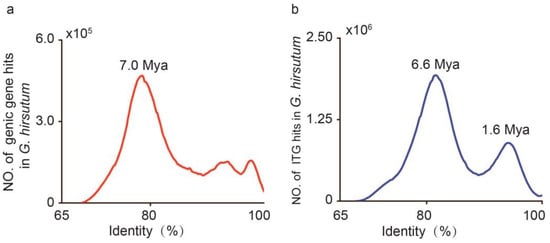 To further investigate the origins of genic genes and ITGs in G. hirsutum, we determined the identity of genic and intergenic genes from the plant’s transcripts. The evolution time of the major peaks was assessed using the Gaussian probability density function (GPDF), which was reported by Huang et al. [20]. One significant peak was discovered at identity of 78.6% (Figure 5a), which indicated that the genic genes from the At and Dt genomes in G. hirsutum were differentiated around 7.0 Mya (Figure 5a), while two distinct peaks with identity at 81.6% and 94.0% were observed in the ITGs of G. hirsutum (Figure 5b). The evolution time of the primary peak was estimated at 6.6 Mya, closely correlated with At and Dt genome differentiation time. Similarly, the secondary peak corresponded to 1.6 Mya, suggesting that the allotetraploid cotton may have generated around 1.6 Mya (Figure 5b).
