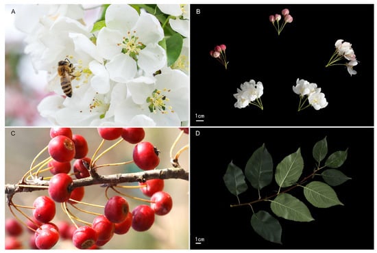 Characteristics of flowers, fruit, and foliage of Malus ‘Baiyun’ crabapple. (A) Flowers of M. ‘Baiyun’; (B) the blooming stage of inflorescence in M. ‘Baiyun’; (C) mature fruit; (D) annual branches and leaves.