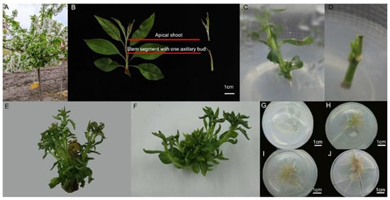 In vitro plant regeneration of M. ‘Baiyun’. (A) Tree used for propagation (about 2.5 m high); (B) different site of explant material; (C) proliferation of adventitious shoots (explant: apical shoot); (D) proliferation of adventitious shoots (explant: stem segment with one axillary bud); (E,F) proliferation of M. ‘Baiyun’ shoots in different combinations of PGRs 30 d. (E) 6-BA + NAA; (F) 6-BA + IBA; (G–J) proliferation of roots of several representative treatments in different PGRs 30 d. on the proliferation of roots. (G) PGR-free (CK); (H) IBA 1.5 mg·L−1 (Treatment No. B6); (I) NAA 0.5 mg·L−1 (Treatment No. B1); (J) NAA 0.6 mg·L−1, IBA 0.7 mg·L−1 (Treatment No. C3).