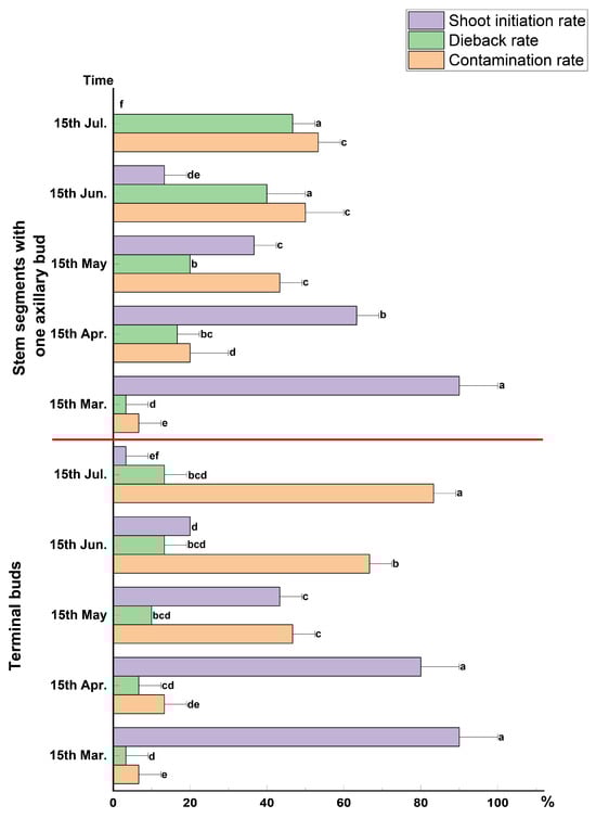 The effect of different extraction sites and times on the sterilization of explants. Two sites: Apical shoots and stem segments with one axillary bud. Five times: 15 March, 15 April, 15 May, 15 June, 15 July. Within each color, mean values with the same letter(s) were not statistically significant based on Duncan’s at p ≤ 0.05.