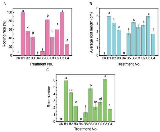 Rooting of M. ‘Baiyun’ in different PGRs 30 d. (CK) PGR-free; (B1) NAA 0.5 mg·L−1; (B2) NAA 1.0 mg·L−1; (B3) NAA 1.5 mg·L−1; (B4) IBA 0.5 mg·L−1; (B5) IBA 1.0 mg·L−1; (B6) IBA 1.5 mg·L−1; (C1) NAA 0.4 mg·L−1, IBA 0.7 mg·L−1; (C2) NAA 0.4 mg·L−1, IBA 1.0 mg·L−1; (C3) NAA 0.6 mg·L−1, IBA 0.7 mg·L−1; (C4) NAA 0.6 mg·L−1, IBA 1.0 mg·L−1. Moreover, for each color, mean values with the same letter(s) were not statistically significant based on Duncan’s at p ≤0.05. (A) Rooting rate; (B) average root length; (C) number of roots.